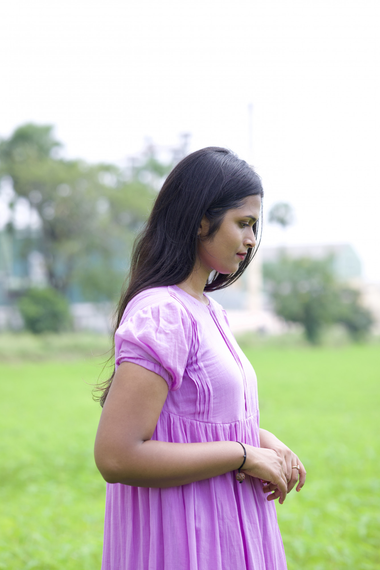 The Lilac dress features a high neckline with a smooth back zip, paired with soft short puff sleeves. Its three-tiered silhouette is crafted from lightweight, pure handwoven mul cotton in a calming lilac hue. Finished with a pleated bodice and handcrafted by skilled Indian artisans, this dress blends comfort, elegance, and thoughtful detailing.