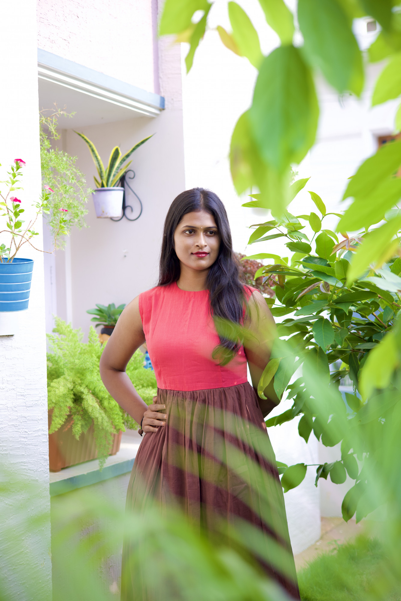 The Rosewood color block dress with high neck and yellow frill at the bottom. It comes with a back zip. It is a lightweight pure handwoven mul cotton fabric handcrafted by local Indian artisans and has a pleated bodice.
